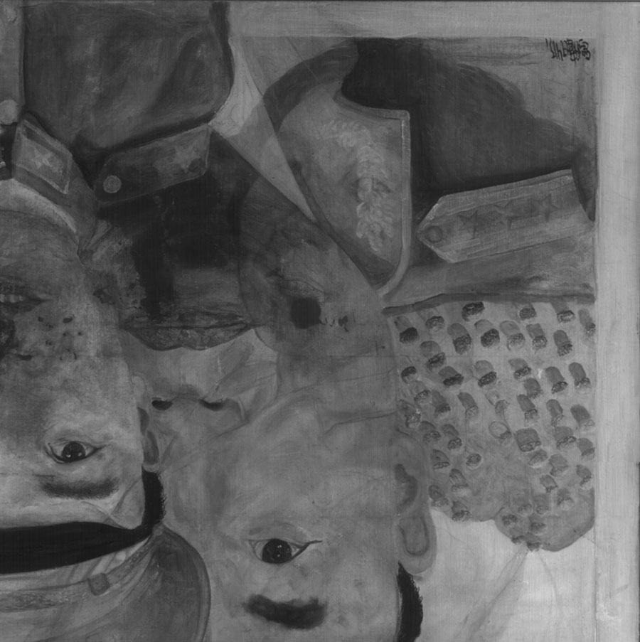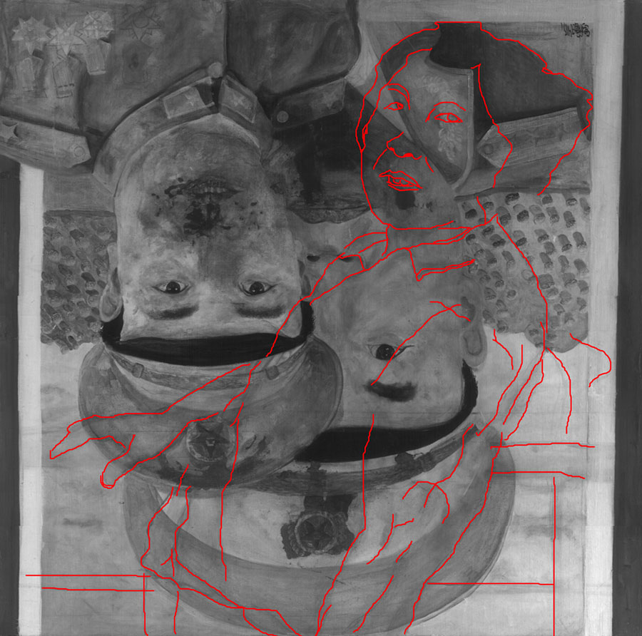 Using the Osiris camera, infrared images of the painting were taken. Also called reflectograms, the images revealed the presence of a former composition underneath the current one. A portrait of a woman is clearly visible and had been almost fully executed before the artist decided to change the subject of his painting.
