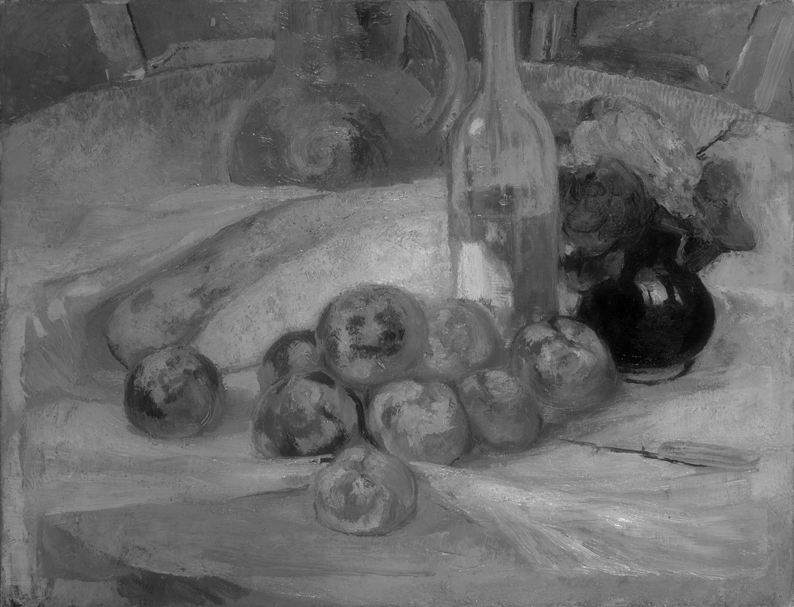 The purpose of studying this still life was to identify the materials present as well as their application in order to contextualize and compare them to Cézanne’s technique.