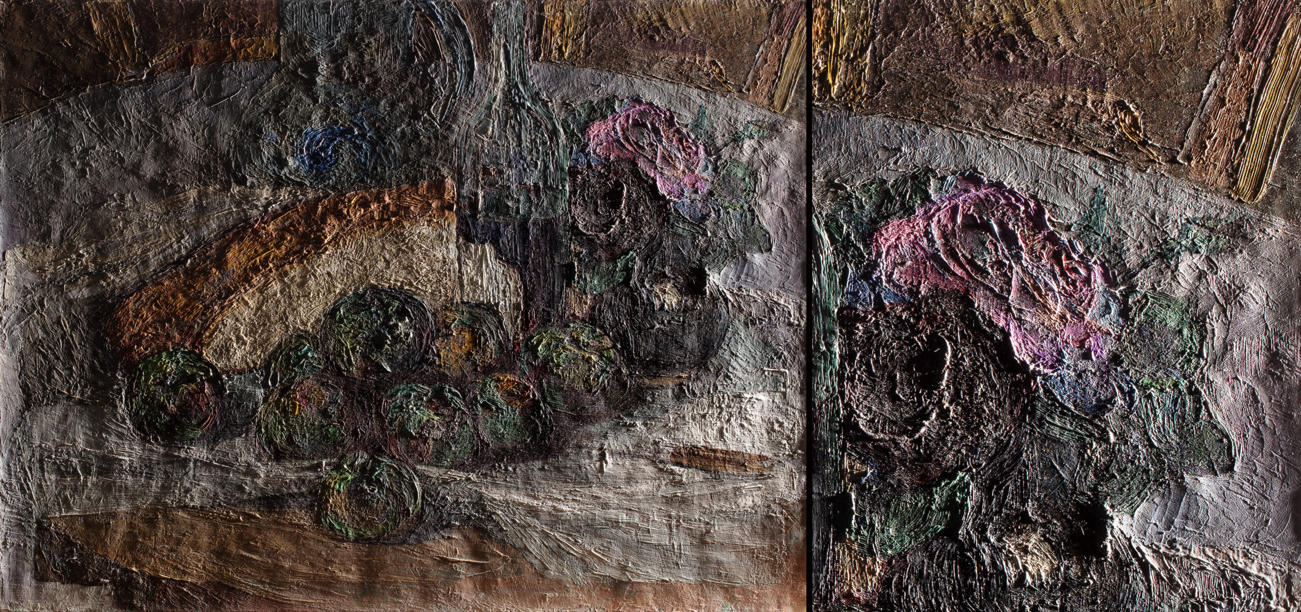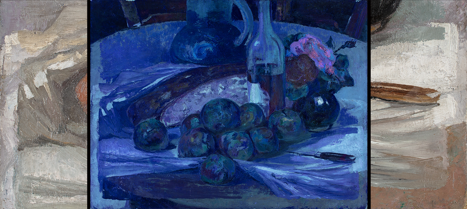 Color is sometimes applied ‘raw’ before being mixed directly on the canvas or on the brush, creating a distinctive effect on certain elements, such as the apples depicted with a multitude of hues.