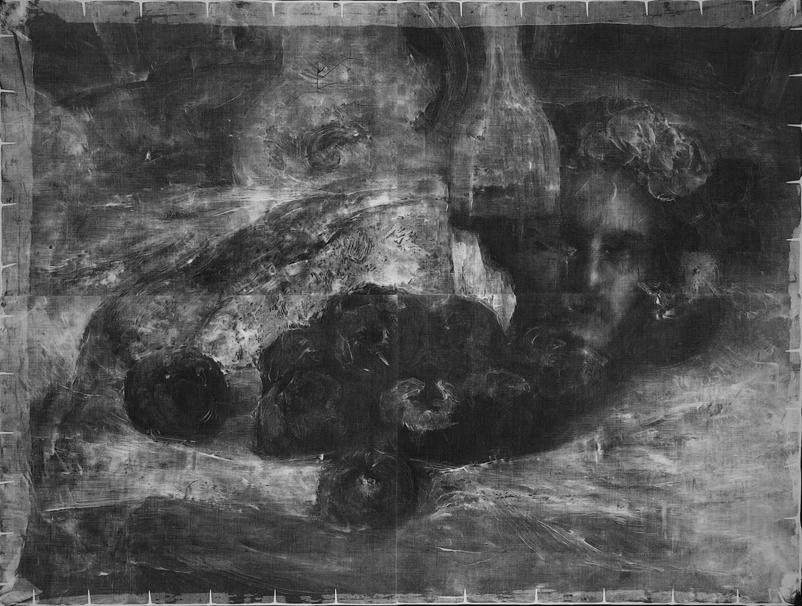 Radiography revealed an underlying composition that is difficult to see under direct light and infrared reflectography: a portrait of a man appears to the left of the composition. Located on the reverse side of the canvas, this portrait was covered with a layer of paint to conceal it.