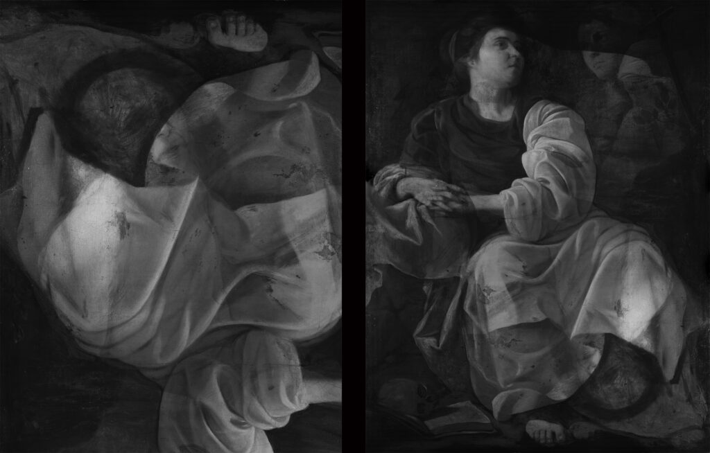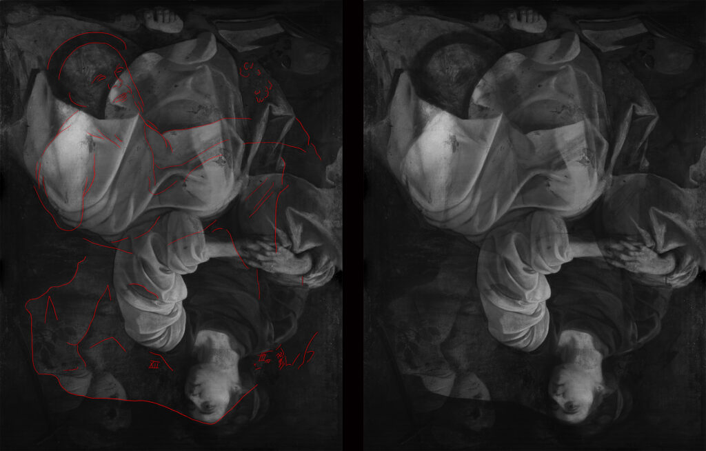 Ce phénomène, couplé à une réflectographie infrarouge réalisée à l’aide de notre caméra Apollo, a confirmé la présence d’une ou plusieurs autres compositions antérieures à celle actuellement visible : retournée, la toile révèle ce qui pourrait être un Saint Jérôme, assis, tenant un livre ou un autre objet, entouré de végétation. Sur la partie inférieure, quelques annotations faites par l’artiste et quelques actes de vandalisme.