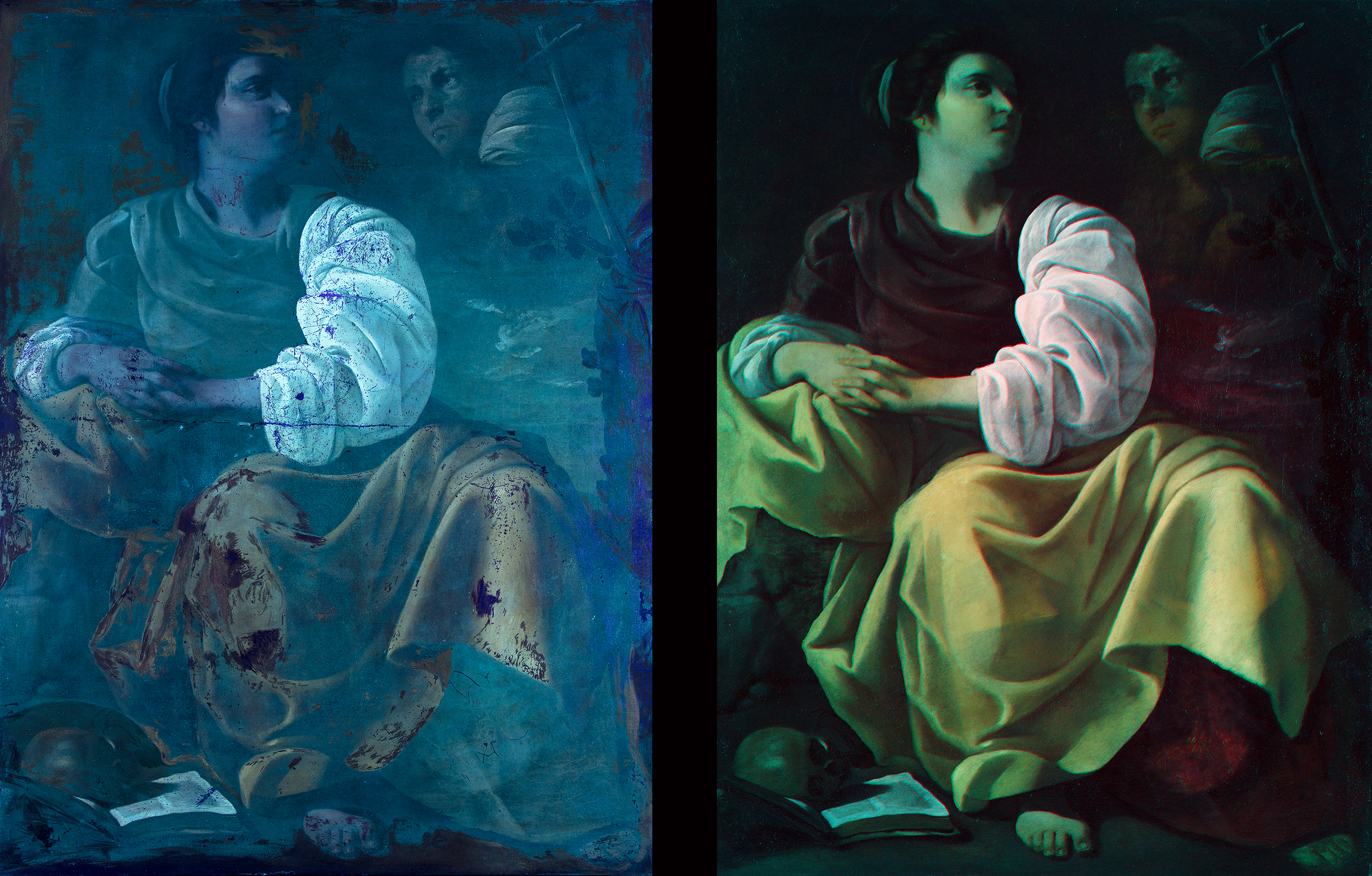 Lumière ultraviolette (gauche) et réflectographie infrarouge fausse couleur (droite) / ©RES