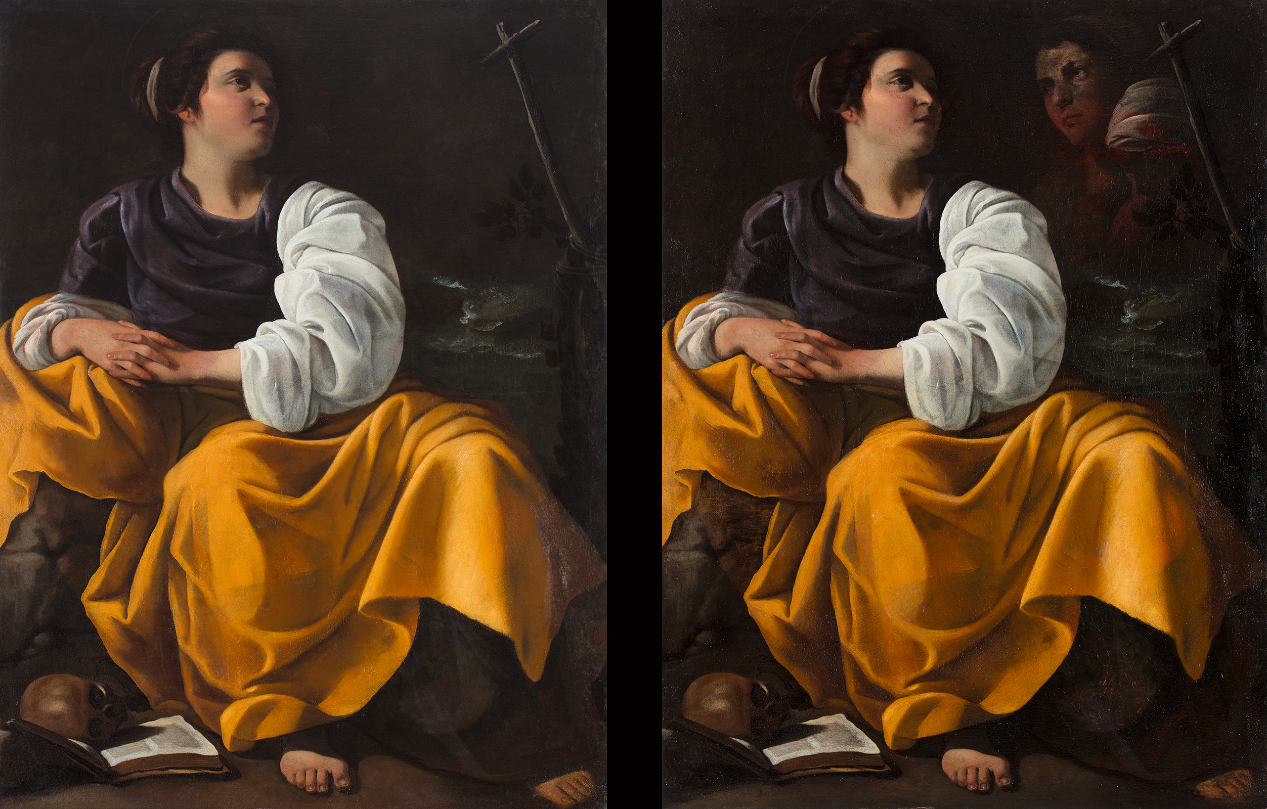On note des similitudes frappantes avec la Madeleine en Extase du Caravage, dans la position et le modelage des mains, ainsi que dans l’apparition de la croix dans la partie supérieure gauche de la toile. La scène se déroule sur une sorte de formation rocheuse, tandis que de douces vagues caressent la mer en arrière-plan. La couche picturale est exécutée sur une préparation homogène et relativement épaisse de couleur rouge-brun, particulièrement visible sur la partie supérieure droite de la toile en raison des transparences accrues dues au vieillissement du film polymère. Dans cette même zone, une figure, qui à l’origine ne faisait pas partie de la peinture finale mais plutôt d’une autre composition antérieure, apparaît comme une vision fantomatique.