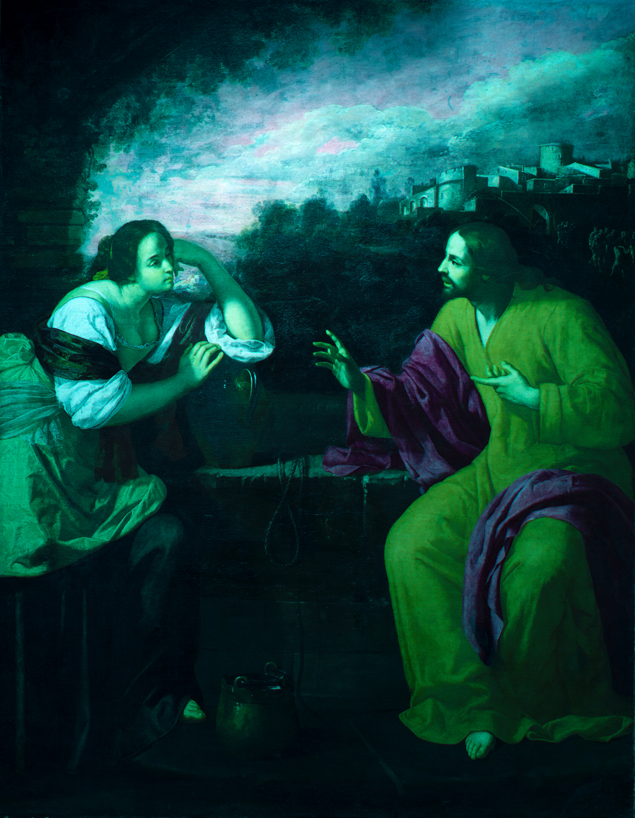 Les contours architecturaux, notamment du puits, sont visibles en transparence comme sur la manche droite du Christ : selon toute vraisemblance, le manteau du Chris a été peint après la mise en place du puits.