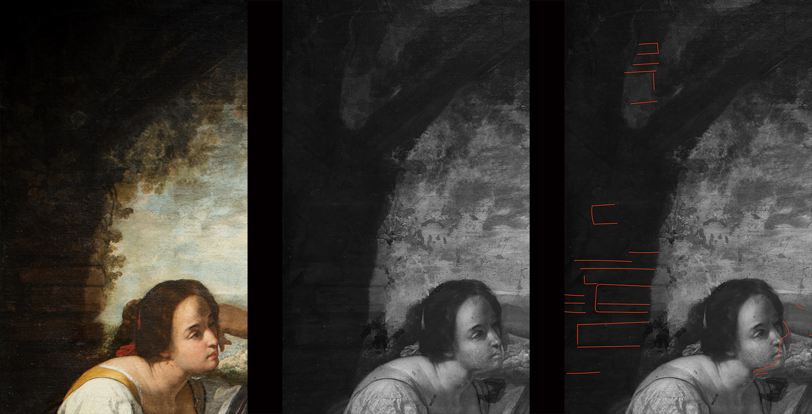 L’analyse de l’imagerie infrarouge a également conduit à une autre hypothèse : sur le puits, entre le Christ et la Samaritaine, dans la manche droite du Christ, ainsi que dans la couronne de l’arbre, des déchirures semblent traverser la toile. La première pourrait être une ancienne couture, probablement retravaillée par l’artiste elle-même.
