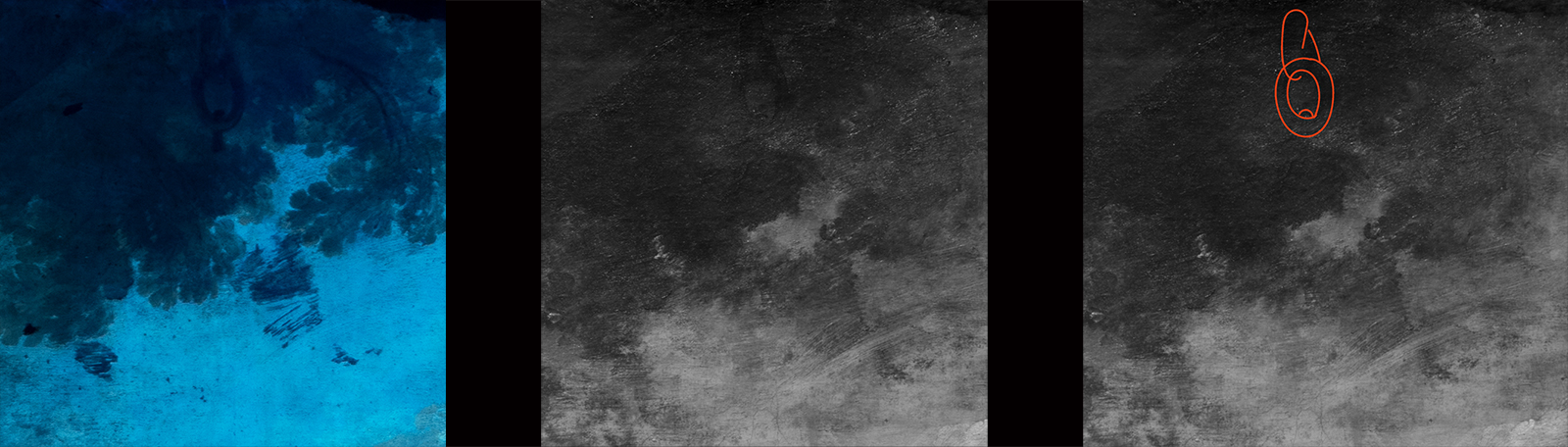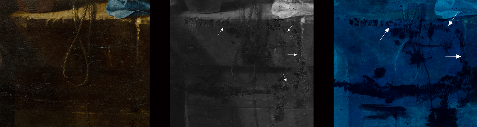 Détails en lumière directe (gauche), réflectographie infrarouge (centre) et lumière ultraviolette (droite) / ©RES