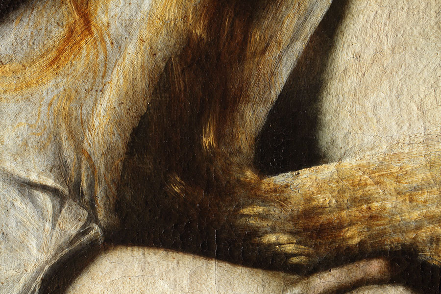 La réflectographie infrarouge met cependant en évidence la présence de lignes sombres, préalables à la peinture, qui définissent les contours de certains éléments de la composition. Ces lignes, assez larges et compatibles avec un pinceau imbibé d’un pigment foncé, délimitent les doigts de la main droite, la partie inférieure de la main gauche et le poignet, les principaux plis de la cape rouge, l’épaule droite et la chemise blanche sur le coude droit. Les irrégularités de la surface qui pourraient suggérer l’utilisation d’incisions, perceptibles surtout au niveau de la chemise blanche, correspondent en fait aux traces des poils du pinceau.