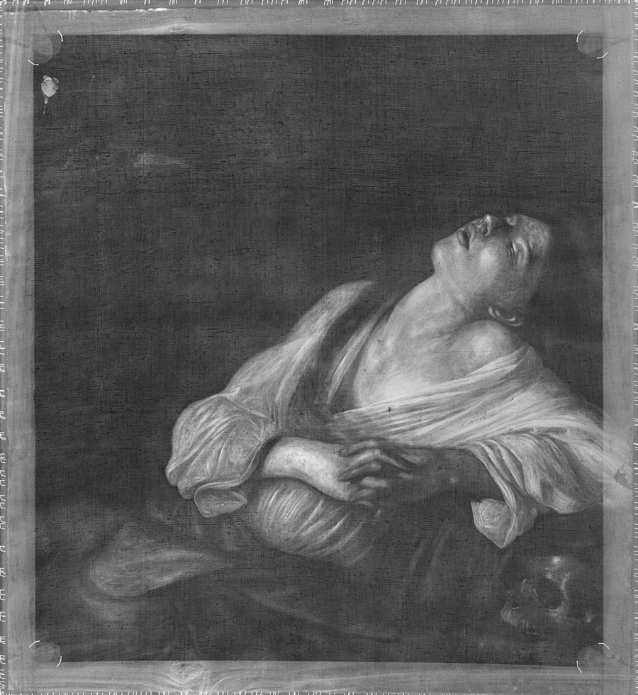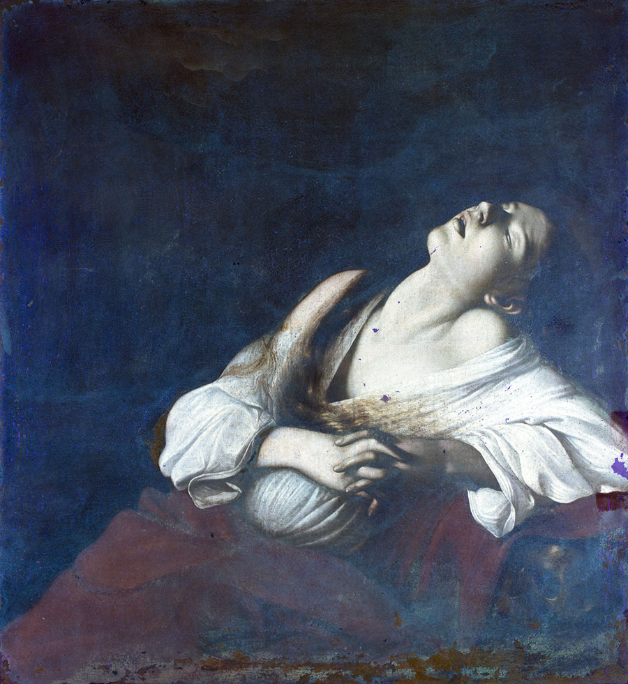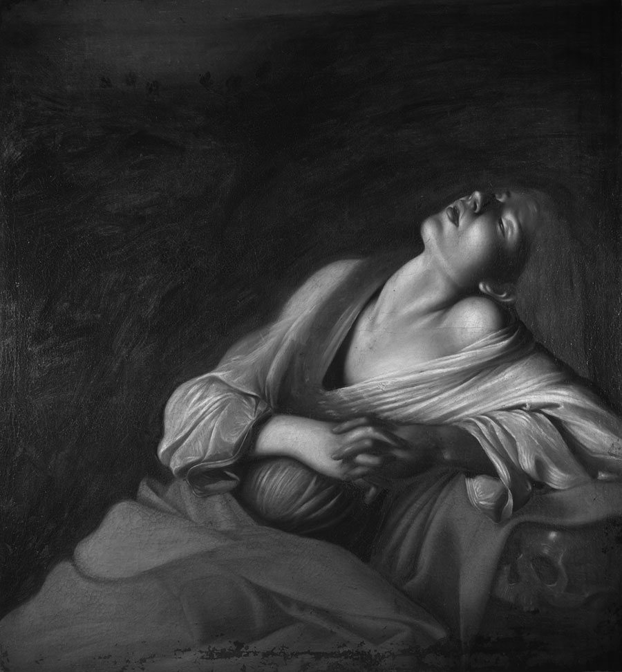 La mise en commun de toutes les données issues des observations de l’imagerie infrarouge, acquise avec notre caméra Apollo, et de l’imagerie ultraviolette, nous communique des informations supplémentaires et semble confirmer davantage l’attribution : le corps à demi couché de la Madeleine n’est pas, comme il semble, enveloppé dans une masse sombre, mais repose sur une sorte de rocher. Elle est située à l’intérieur d’une grotte, dont l’ouverture est enrichie de feuilles et de végétation, se détachant clairement dans le coin supérieur gauche. Peut-être pas tout à fait convaincu de ce qu’il faisait, l’artiste a utilisé un coup de pinceau léger, décidant ensuite de cacher ces éléments sous une couche sombre. Maurizio Calvesi a interprété le fond noir comme l’obscurité, « symbole du mal et du péché », tandis que la lumière qui inonde la figure féminine symbolise la rédemption.