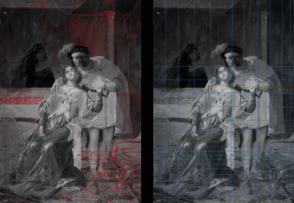 Relevés du dessin sous-jacent (gauche) et du quadrillage (droite) / ©RES