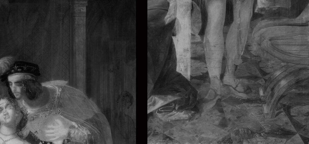 La réflectographie infrarouge, réalisée avec notre caméra Apollo, révèle un tracé très détaillé de l’ensemble de la composition, ainsi qu’un quadrillage suggérant une étude préliminaire minutieuse.