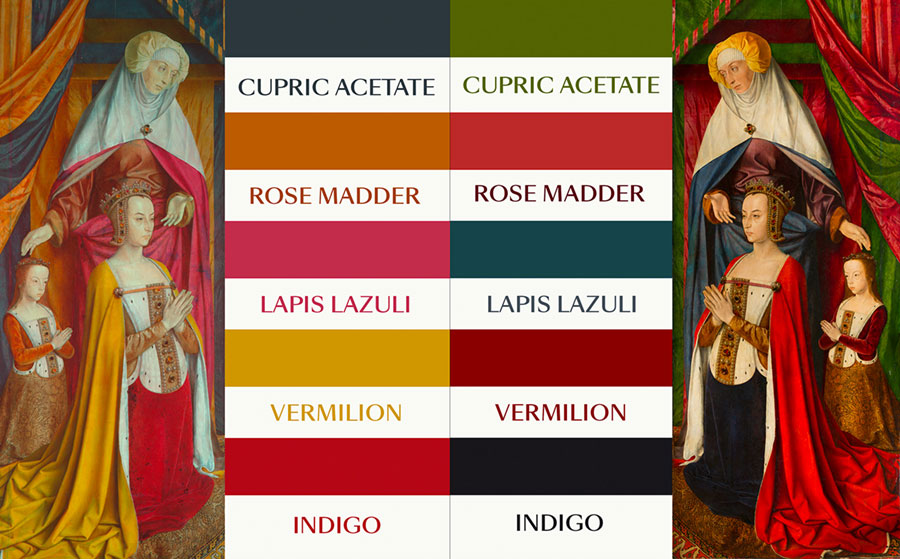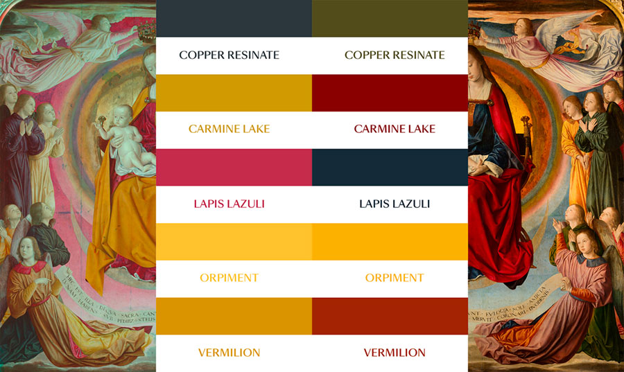 Les images en fausse couleur suggèrent l’utilisation des suivants pigments : blanc de plomb, vermillon, acétate ou résinate cuivrique. L’observation microscopique révèle que le manteau de Sainte Anne et celui de la Vierge ont été peints avec du lapis-lazuli, un pigment très coûteux qui souligne l’importance de cette commande.