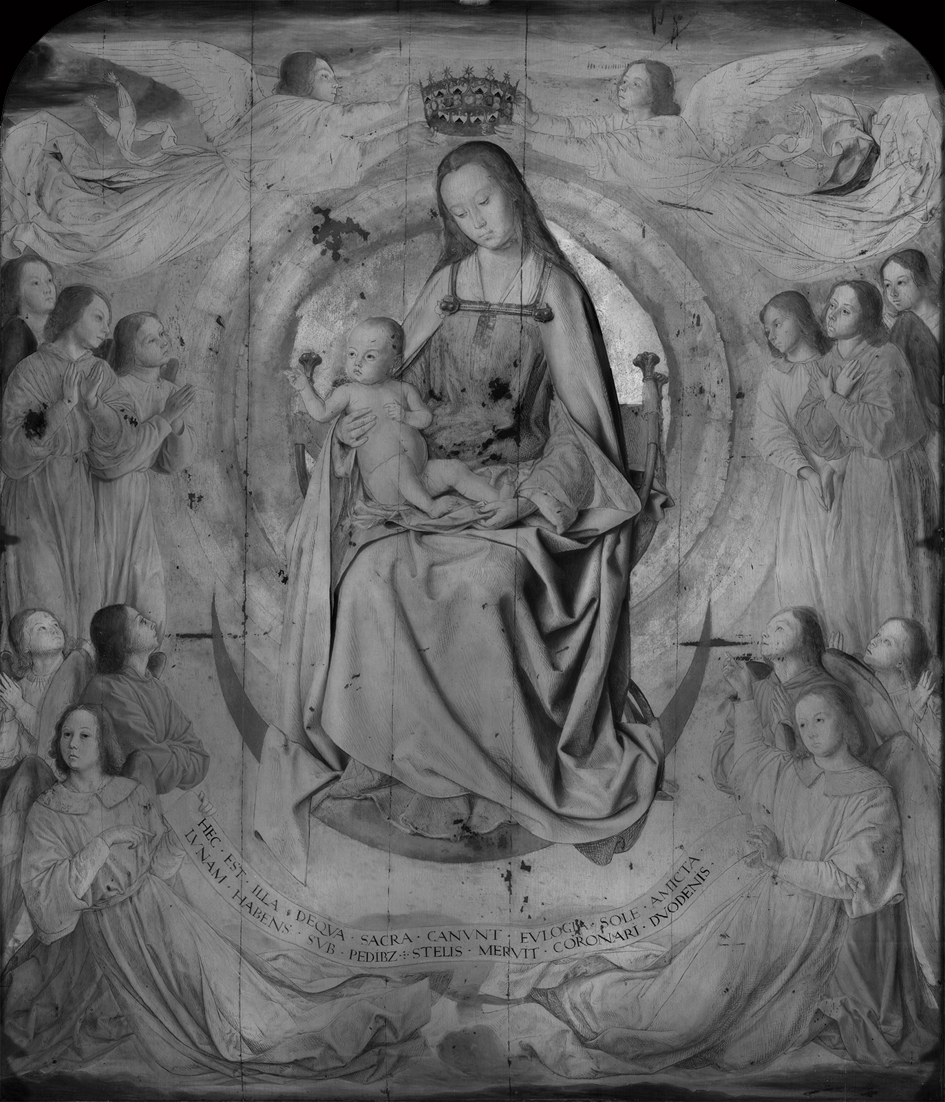 Le panneau central présente la Vierge sur un trône entourée d’anges, tenant l’Enfant sur ses genoux. Dans la partie supérieure, deux anges portent une couronne d’étoiles au-dessus de la tête de la Vierge tandis que six autres, trois de chaque côté du trône, la regardent. Dans la partie inférieure, deux anges tiennent une inscription latine tirée de l’Apocalypse XII « Hec est illa deqva sacra canvnt evlogia sole amicta lvnam habens svb pedibz stelis mervit coronari dvodenis », que l’on peut traduire grossièrement par « Voici celle qui est louée dans les Saintes Écritures : enveloppée par le soleil, ayant la lune sous ses pieds, elle mérite d’être couronnée de douze étoiles ». La Vierge est vêtue d’un lourd manteau rouge, typique des Vierges flamandes, anticipant la Passion du Christ.