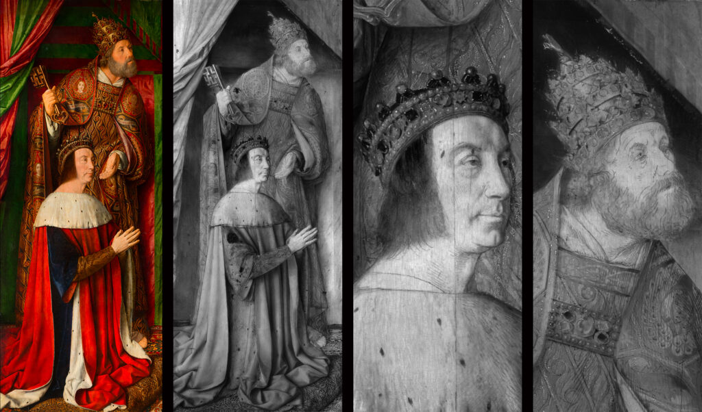Dans les deux panneaux, les visages des donateurs semblent avoir fait l’objet d’un dessin préparatoire très précis dans un souci de réalisme. Aucun repentir n’est observé par rapport à l’exécution peinte.