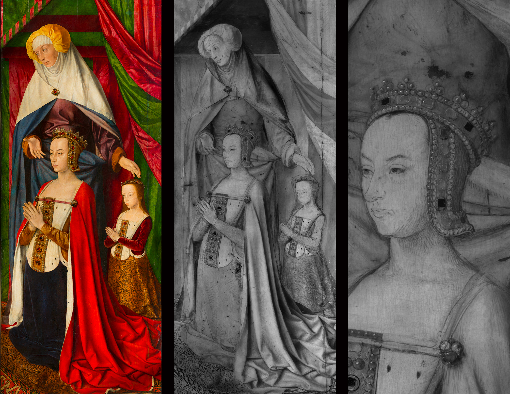Lumière directe (gauche) et réflectographie infrarouge avec détails / ©RES